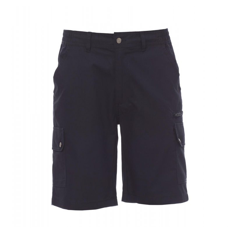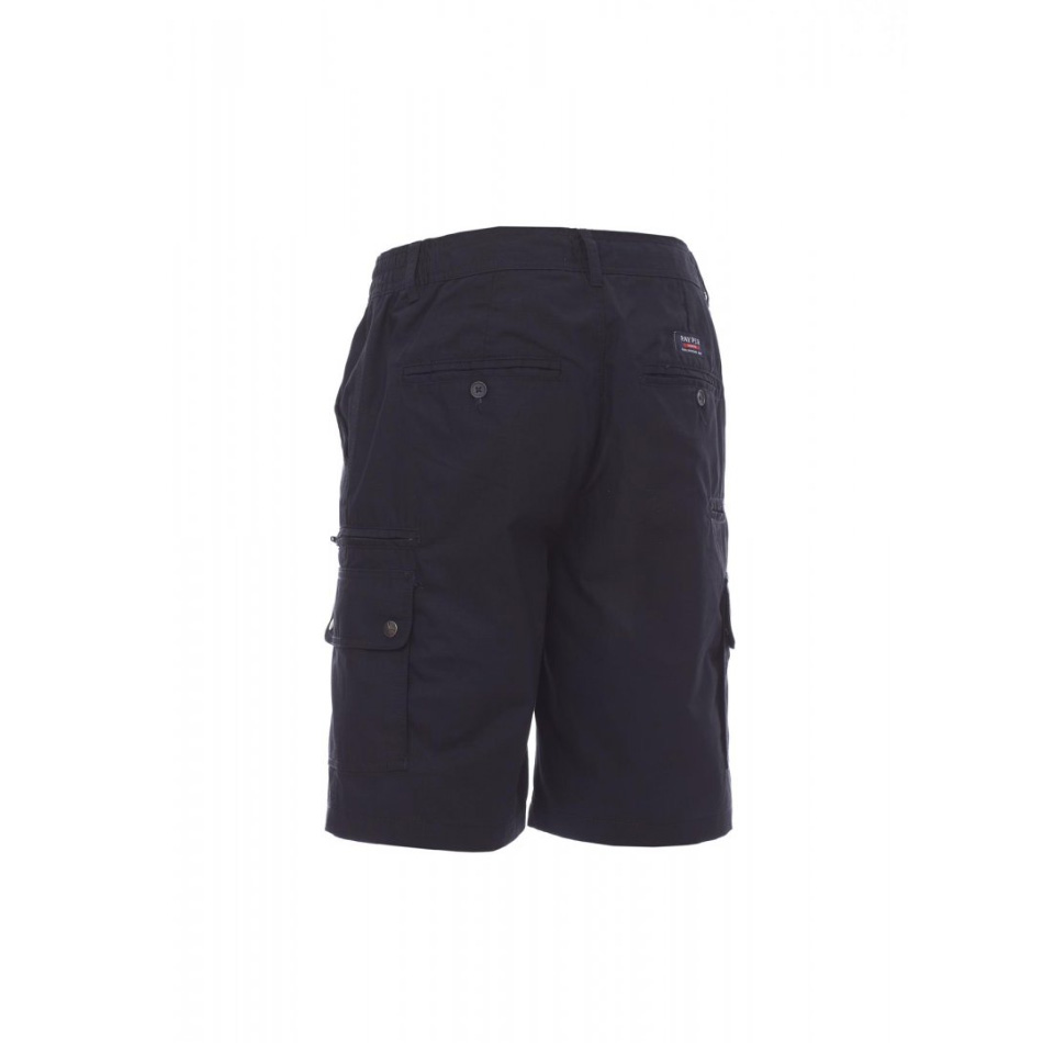 Bermuda uomo, elastici laterali e passanti in vita, chiusura con zip e bottone in metallo, due tasche anteriori a taglio classico, due tasche laterali con patta e bottoni automatici, una tasca con zip lato sinistro, un porta metro a scomparsa lato destro, due tasche posteriori a filo con asola e bottone.