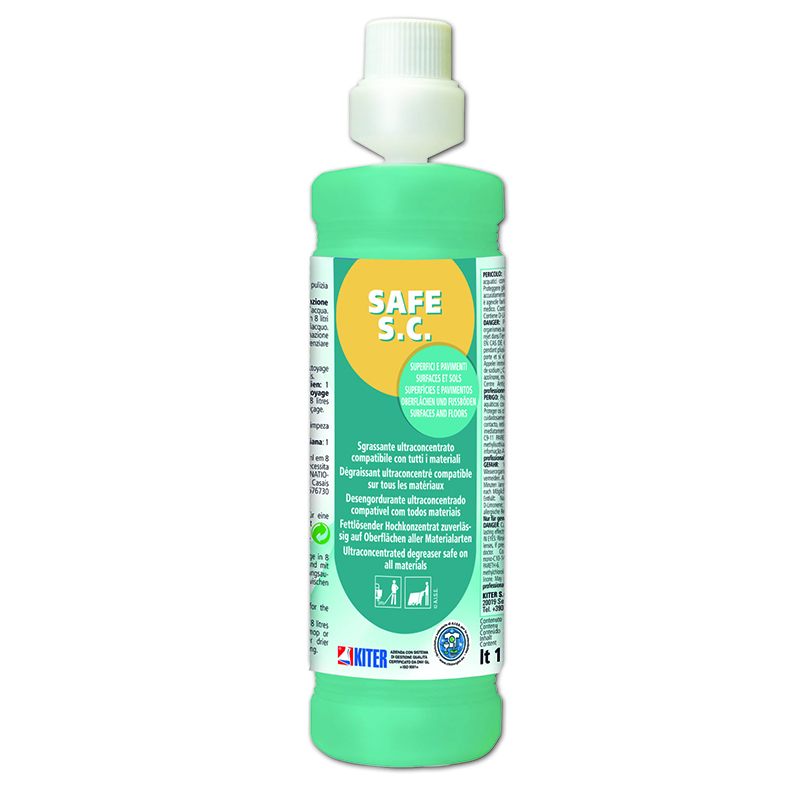 Sgrassante neutro ultraconcentrato sicuro su tutti i materiali, anche i più delicati. Esente da solventi e sostanze aggressive. SAFE S.C. si usa sia per pulizie quotidiane